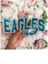 Show your Eagles pride with this stunning 10.5-inch Philadelphia Eagles chenille patch! Featuring vibrant green sequined "EAGLES" lettering with the iconic eagle logo, white/silver borders, this large iron-on patch is perfect for creating game-day ready apparel and accessories.